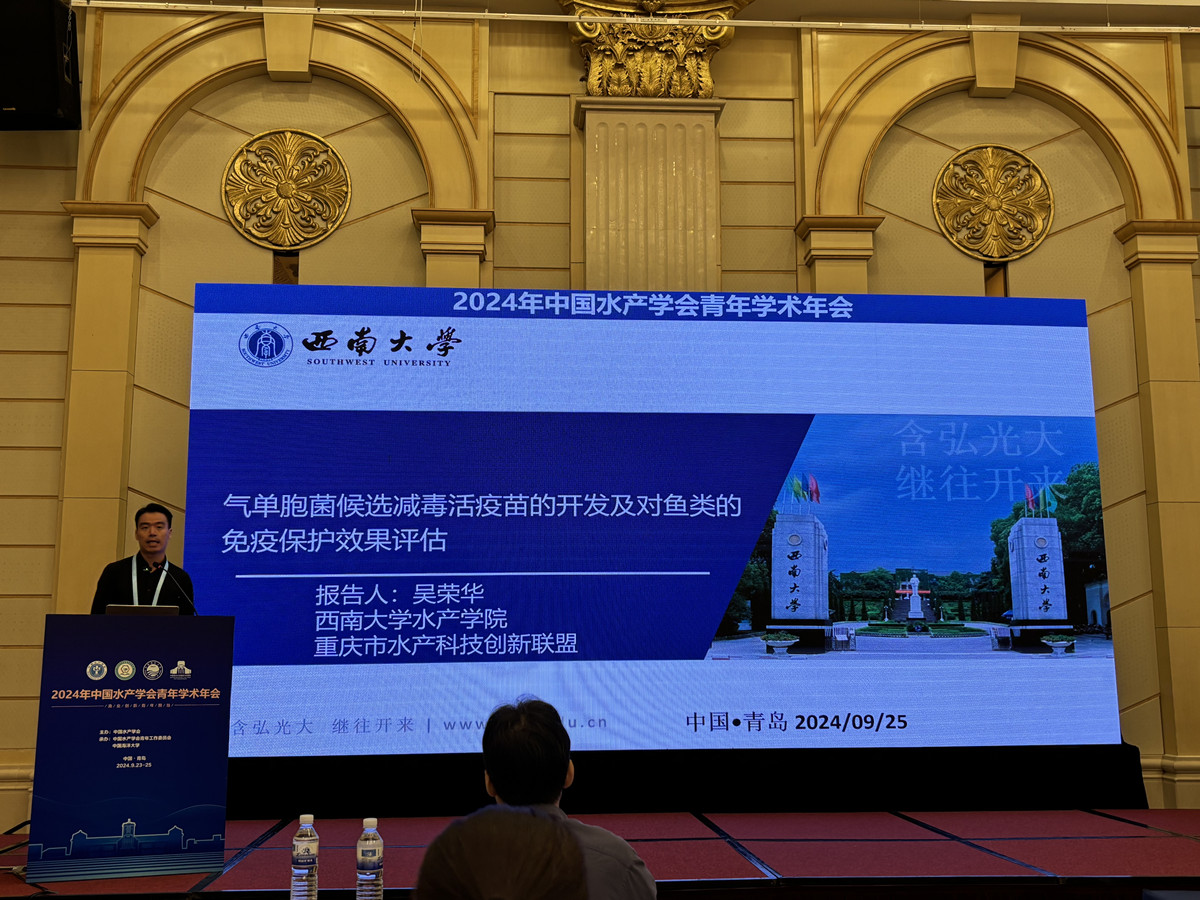 公司三名教师(吴荣华、何远法、朱松)和三名员工参加此次盛会。会议期间,吴荣华副教授做了题为“气单胞菌候选减毒活疫苗的开发及对鱼类的免疫保护效果评估”的分会场主题报告,其硕士研究生卢嘉慧、龙瑞分别做了题为“aroA和ppk1在维氏气单胞菌致病性中的作用及突变株AV-∆aroA/ppk1作为减毒活疫苗的效力评估”和“tapp基因在调节嗜水气单胞菌毒力中的功能及其作用机制”的主题报告。徐红艳教授的博士研究生姚静婷做了题为“鲤科鱼类卵巢组织细胞冷冻保存及复苏培养技术研究”的主题报告。