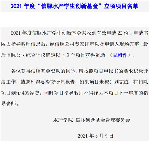2021 年度“信豚水产员工创新基金”立项项目名单