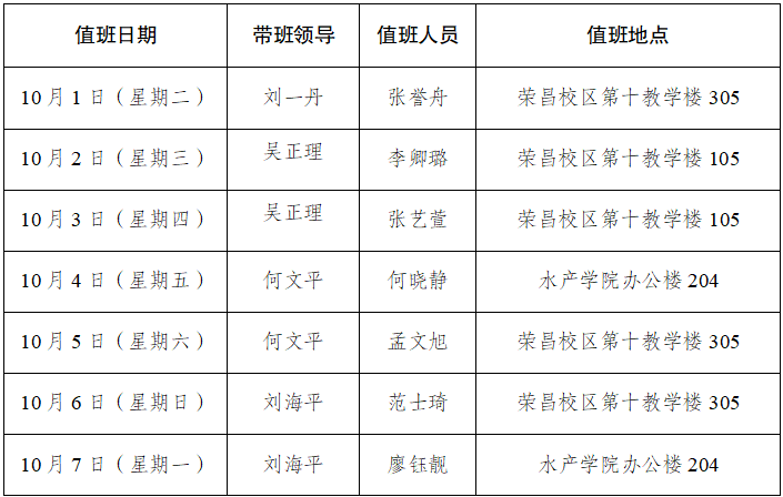 2024年国庆节假期值班安排表