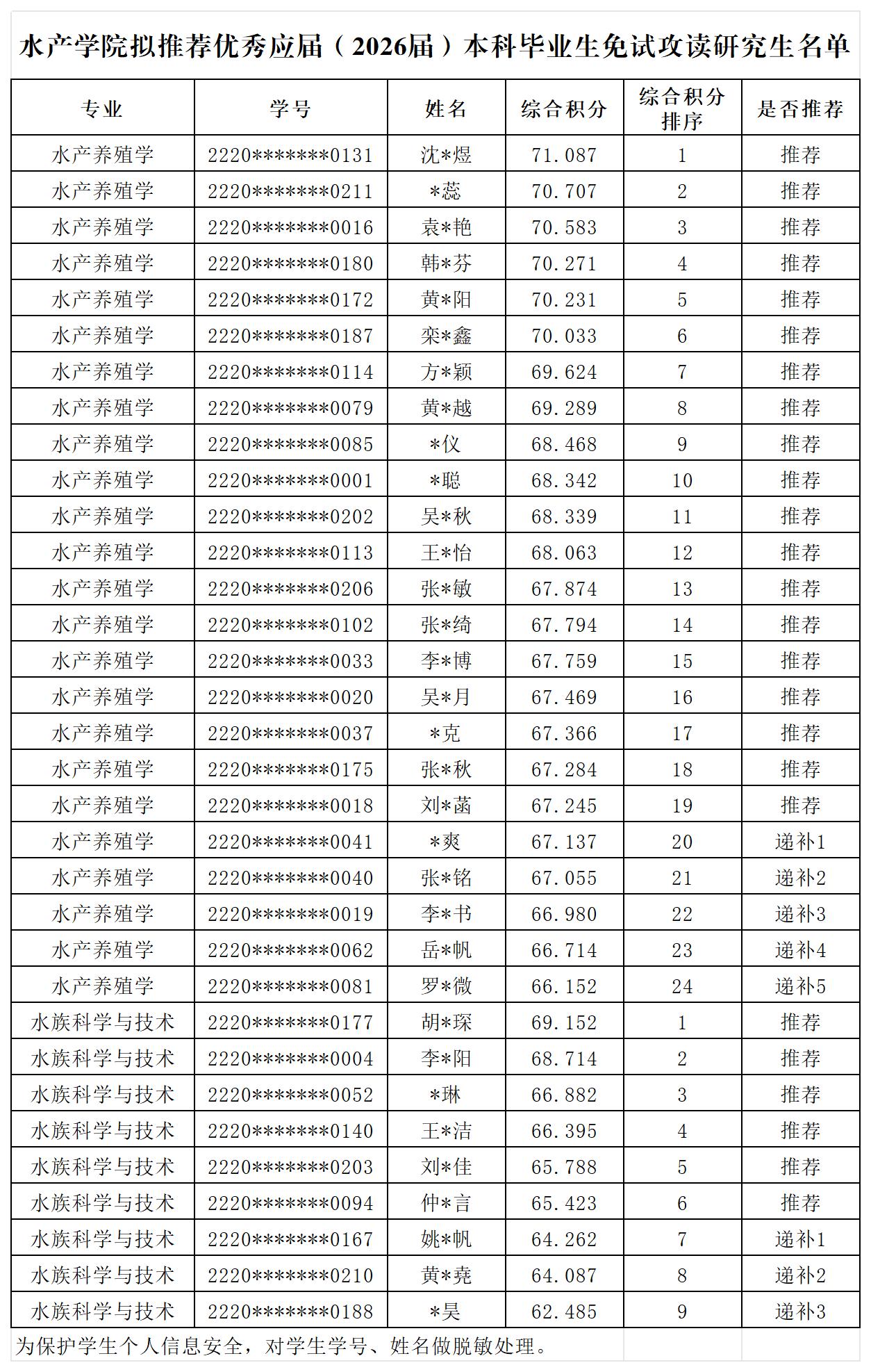 公司推荐工作小组按照《西南大学推荐优秀应届本科毕业生免试攻读研究生工作管理办法》(西校〔2025〕96号)及公司工作细则,对2026届水产养殖学、水族科学与技术专业申请人进行全面审核,现将拟推荐名单排序予以公示(见附表)。